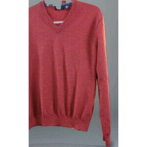 Hickey Golf mens size Large 100% merino wool sweater in a red/burnt orange tone. Classic V-neck style with ribbed cuffs and hem perfect for golf, Ivy League prep style, or layered business casual looks.
