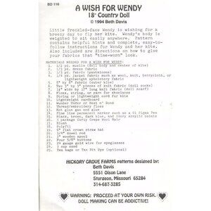 This "A Wish for Wendy" 18 inch Country Doll Pattern from Hickory Grove Farms is a great choice for any doll lover. It was released in 1994 and is perfect for crafting a one-of-a-kind doll. The pattern includes instructions needed to make a unique country doll. With the help of this pattern, you can create a timeless, heirloom-quality doll that will be cherished for years to come.