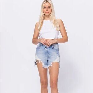 LIGHT WASH HEAVY FRAY UNEVEN WAISTBAND MOM SHORTS WITH 100% COTTON. Button fly closure. Front and back pockets.