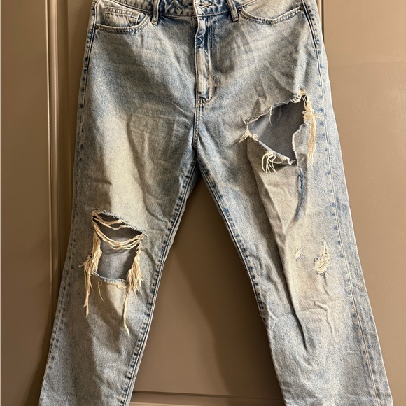 Stylish distressed ladies jeans in a classic light blue color. Perfect for a casual, trendy look.
