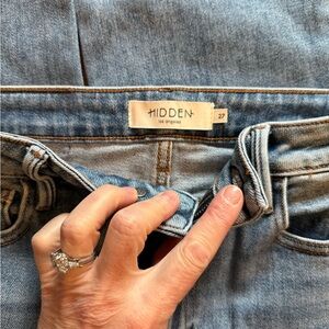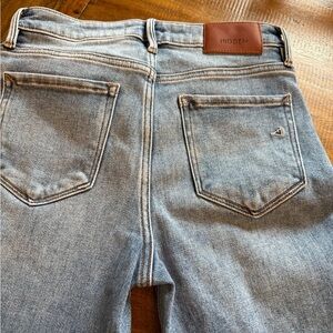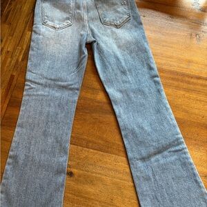Trendy cropped split flare style. Lighter blue denim jeans. Size 27, about a 26/27 inch inseam. **See last pic for a similar style, **not the exact same jeans. EUC.