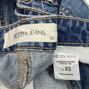Stylish hidden jeans denim mini skirt for women in size XS. Featuring a blue floral embroidery and distressed button closure, this short skirt is perfect for a party or casual outing. Made from a cotton blend denim fabric, this skirt by Hidden Jeans in a regular fit adds a touch of trendy flair to any outfit.
