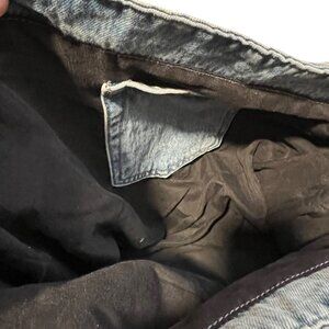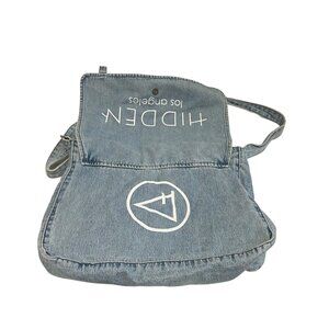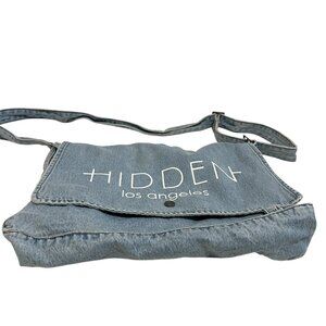 Hidden Los Angeles messenger bag, light wash denim, adjustable shoulder strap, flap and snap closure, measures approx: 15X11X3", gently used, no visible flaws