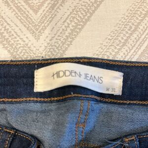 Hidden Women’s Dark Denim Wash Ripped At the Bottom Jeans. Skinny/straight Leg. Inseam approximately 26”. Size 31.