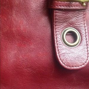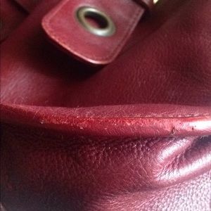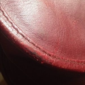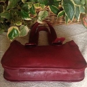 This is a very rich and sturdy preowned leather purse by Hidesign. It has double adjustable thick handles, top zipper closure and golden bronze accents. Inside there's a leather trimmed zipper compartment on one side and a small leather trimmed slip pocket with 2 pen holders on the other side. There's minor stains on the lining and markings on the leather, see pictures. This deep red/burgundy purse is in excellent preowned condition.