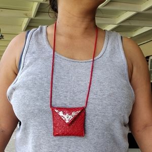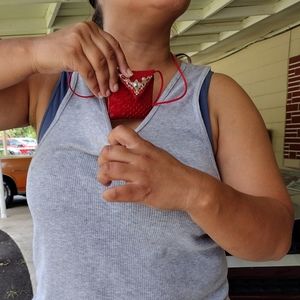 it goes on your neck with a 33' in leather cord, when hitten under, you can wear and tuck it inside your top 0 it's hitten no body will now you have it. it can also be wear outside of your top as fashion accessory. this cute pouch measures