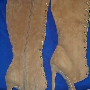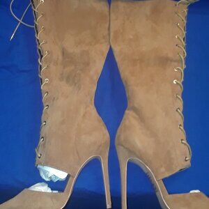 Elevate your look to new heights when you wear these skin-tight boots. Stretchy fabric boots feature a stilletto, cut-out heel, and a fitted over-the-knee shaft with a top drawstring closure. Finished with a stilletto heel, a ridged sole, and a side zipper for easy wear.