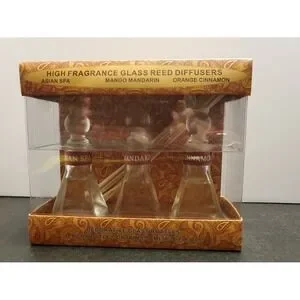 High Fragrance Glass Reed Diffusers. 3 scents Asian Spa, Mango Mandarin, Orange Cinnamon. 24 Rattan Sticks, 3 1.76 oz bottles.