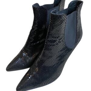 Tsakiris Mallas brand textured black leather high heel ankle boots - these pull on booties have a pointy toe and a sexy 3.5" high covered stiletto heel. So cute in EU size 38 that equates to about a US size 7.5M. Elastic vents on the inner and outer ankle allow for plenty of stretch to ensure a perfect fit. Uppers look fantastic - light wear on the soles - these are ready to go!