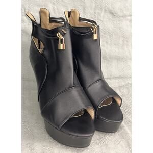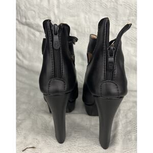 These black high heel booties in size 6.5 - 7 feature a peep toe design, zipper back closure, and ankle band with lock. ( see pics) The ultra high block heel adds a stylish and trendy touch to the booties, making them perfect for parties, cocktails, or business events. Made from faux leather with a fabric lining, these lightweight boots are a limited edition addition to any woman's wardrobe. The ankle bracelet accent and side slits add a unique flair to these ankle boots, making them a coveted choice for fashion-forward women.