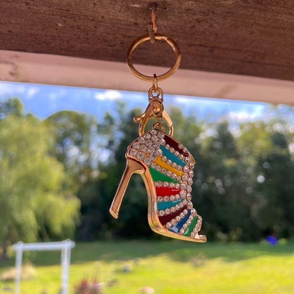 Add a touch of glamour to your accessories with this multicolor rhinestone high heel keychain. Perfect for a bag charm. Rhinestones