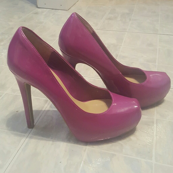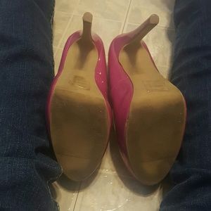 Fusia pink closed, slightly squared toe heels. They are 4-5" tall depending on how you measure your heels. They have been gently worn as you can tell by last picture by the bottom sole. There is a very small scuff on the bottom of the right heel. (As shown in pic #3). They are very classy shoes to wear with a dress, straight legged jeans, or a suit. Smoke free home!