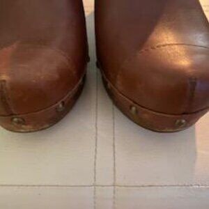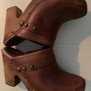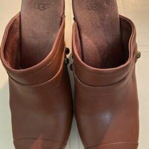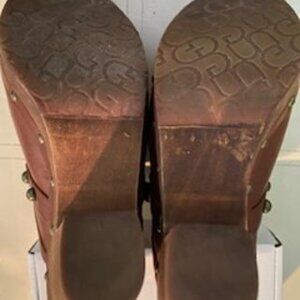 Womens Ugg Jolene, Brown Leather Studded Wooden Heel Clogs Shoes