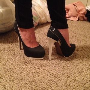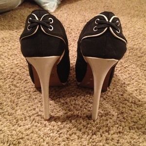 Black and white high heels. Have been worn as seen in photo. In good condition. Has cute cross design on back.