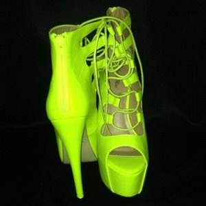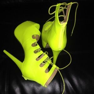 Lime Green heels that tightly hug your ankle. They're sexy with jeans, skirts, or dresses.