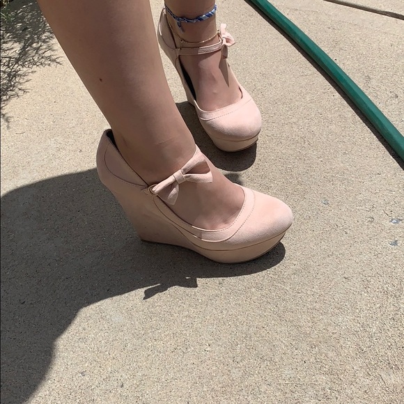 Light pink Suede wedges with a bow clasp. Barely worn, like brand new.