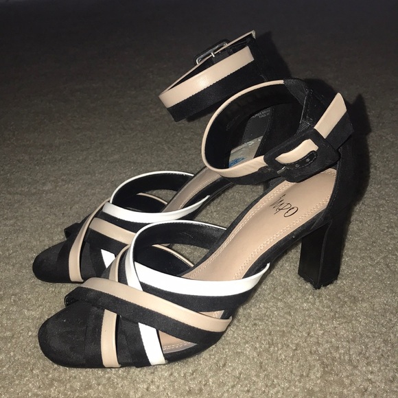 NWOT. Beige, white & black high heels. Buckle around ankle. Never worn. 3 1/2 inch heel