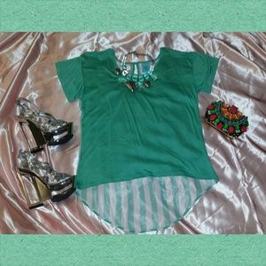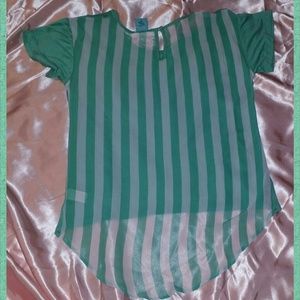 Mint. High low design. Solid color mint in front of blouse with vertical white and mint stripes on back of blouse. Short sleeves. Key hole button design on back. Pocket on front. NWOT