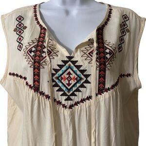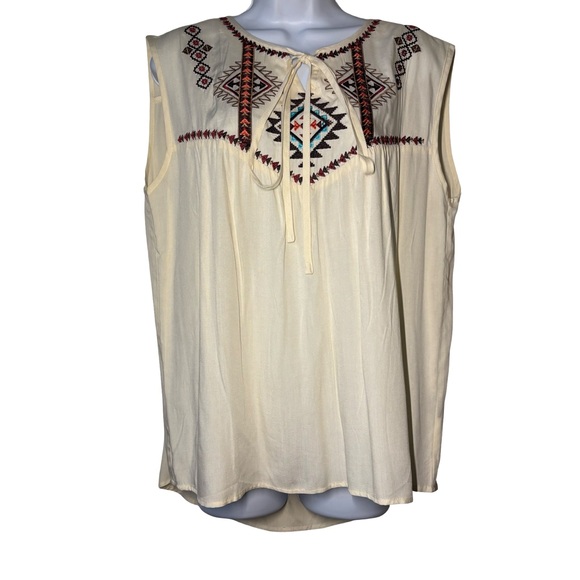 Cream sleeveless top with tribal-inspired turquoise, maroon, and coral colored embroidery. Ties at the front neckline. Lightweight material.