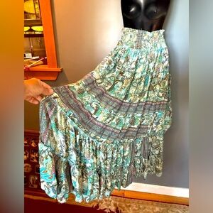 This High Low Ruffled Art Silk Skirt in one size with an elasticized waistband and gold accents is a stylish and versatile piece suitable for casual occasions in the warmer seasons. Made from a silk and poly blend fabric, this skirt is Beautiful Indian Artistry featuring a multicolor design with a bohemian theme. The high rise and ruffle accents add a touch of flair to the long skirt, making it a perfect addition to any woman's wardrobe for the summer, fall, or spring seasons. With its unique style and attention to detail, this skirt is sure to make a statement. Labeled "Free Size"