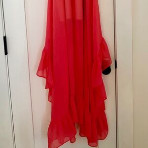 Summer dress in a hot coral color with a lining. Deep v in the front is so flattering!