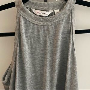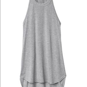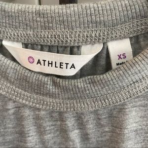 In like new condition. No tag but never worn. No signs of wear. Buttery soft! Athleta size xs. Light grey. 50% polyester 50% rayon. Oversized fit. Longer in the back with a scooped hem. Athleta no longer makes this style and it’s such a great basic tank!