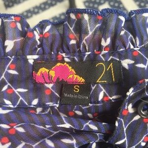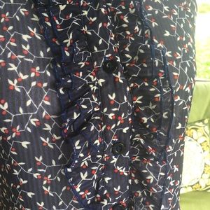 Features a high neckline with delicate ruffle trim and a partial button-down front.