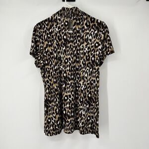 High Neck Short Sleeve Animal Cheetah Print Blouse Top XL Demure Stretchy Classy