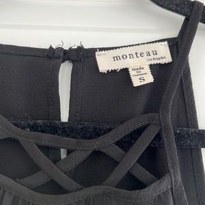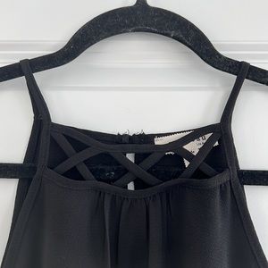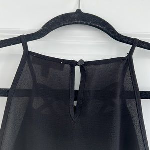 black high neck tank with a criss cross design on the neck. the straps aren’t adjustable. size S. the back of the neck has a cute keyhole design that buttons at the top. made of 100% polyester.
