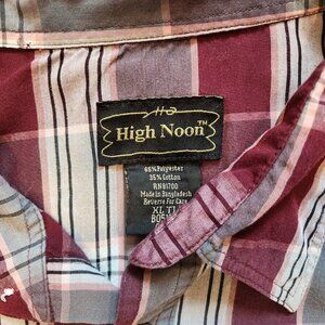 The High Noon Men's Pearl Snap Shirt in size XL is a stylish and versatile piece perfect for casual, travel, or workwear occasions. Featuring a classic fit with a collared neckline and pearl snap closure, this burgundy and gray plaid shirt with short sleeves offers a touch of Western flair. Made from a blend of polyester and cotton, this lightweight and easy-care shirt is machine washable for added convenience. With its retro-inspired design and spread collar, this shirt is ideal for those who appreciate timeless style with a nod to cowboy culture.
