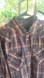 Men's brown and black plaid pearl snap front shirt. Western styling with yolk. Pearl snaps down the front and at wrists. The top button at the neckline is a button versus pearl snap. Two chest pockets with pearl snap closure. Size large. Good pre-owned condition.