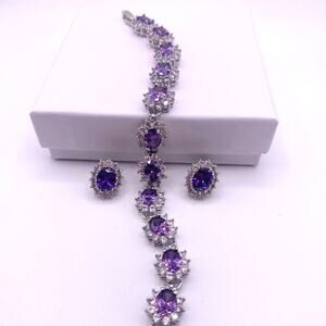 This high-quality rhodium and silver-plated bracelet and stud earrings set from the 2000s features beautiful lab-created amethyst stones. The bracelet measures 6.5 inches and comes with matching stud earrings, making it a perfect set for formal occasions, parties, or gifting. The elegant design and brilliant shine make this jewelry set a timeless addition to any collection.