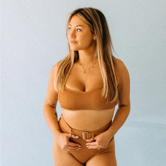 Chic bikini set with a ribbed texture. Features a belt detail for added style. Perfect for beach days.
