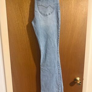Elevate your style with these high rise bootcut jeans in a classic light blue. Perfect for any occasion, these jeans offer both comfort and a flattering fit.