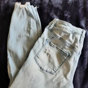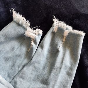 Cropped jeggings with frayed ankles and ripped front. High rise and super skinny style.