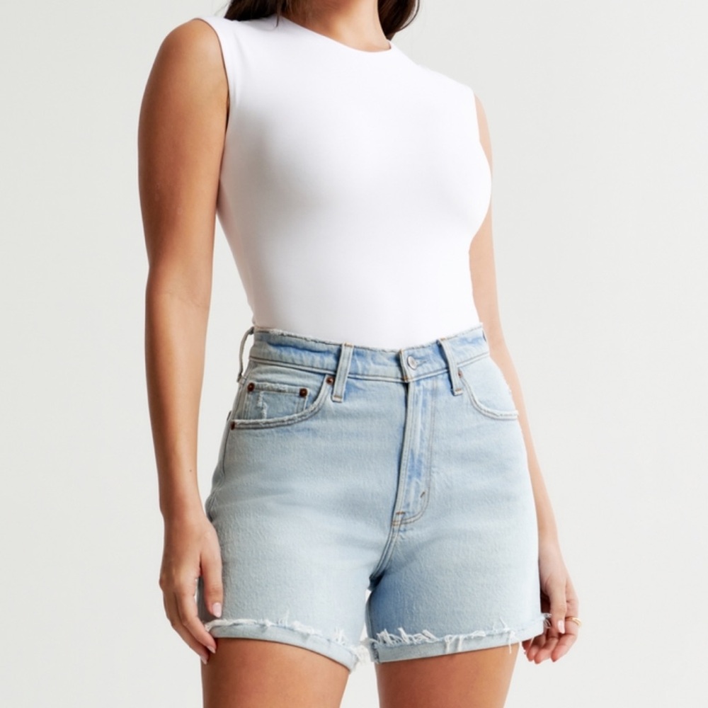 High rise with a relaxed fit throughout the hip and thigh, and a 5 inch (13 cm) inseam. Vintage stretch denim in a light wash, with on-trend rolled frayed hem.