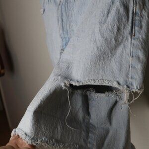 There is a 'cut' in the shorts in the side of the leg, that was intentional by A&F, not a defect.