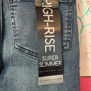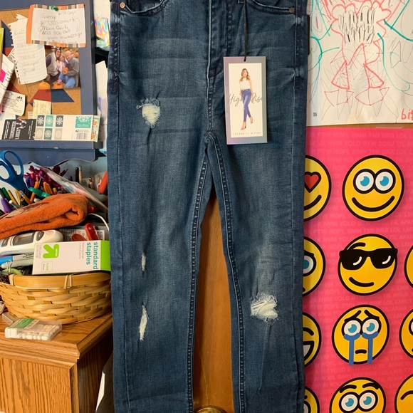 Trendy high rise jeans. Features stylish distressing. Perfect for casual wear.