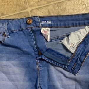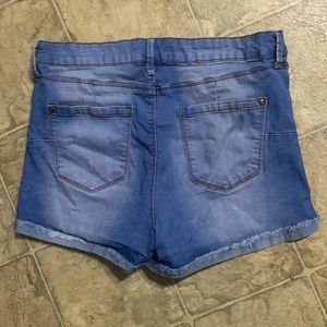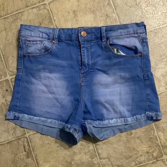 High Rise Blue Jean Shorts They go to mid thigh. Brand No Bo Size: 13 77% cotton 21% polyester 1% Rayon 1% spandex