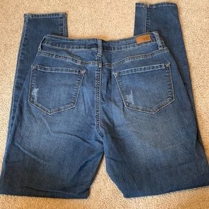 These are stretchy and flattering, small rips throughout the thigh. Size 7 and fits true to size.