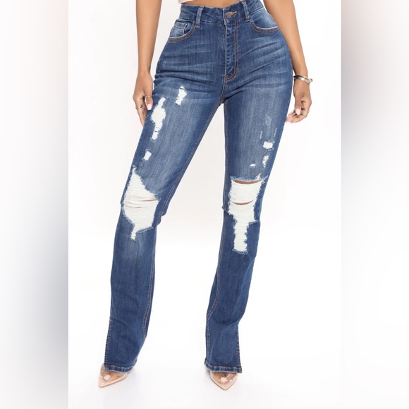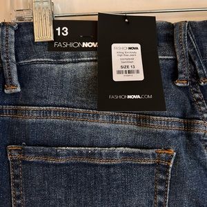 Deep navy blue wash, stretchy material; size 13 fashion nova is about a 10 but size is not available on this site; front and back pockets, relaxed fit leg with split on outer edge; never worn, tags are still attached. All photos are taken in daylight without filters added. Price firm.