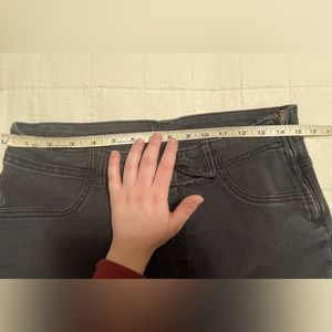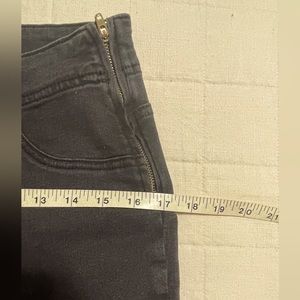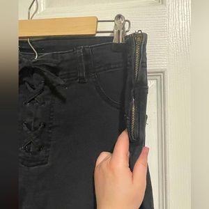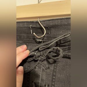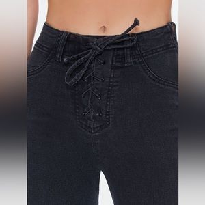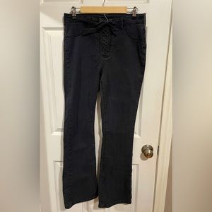 High-rise, bootcut jeans featuring a self-tie lace-up fly, belt loops, and an exposed side zipper. Soft, thin, flexible fabric. Has a worn look (from the wash is was manufactured with, not from wearing them!!)