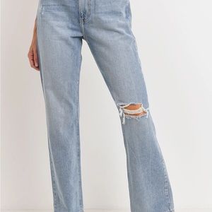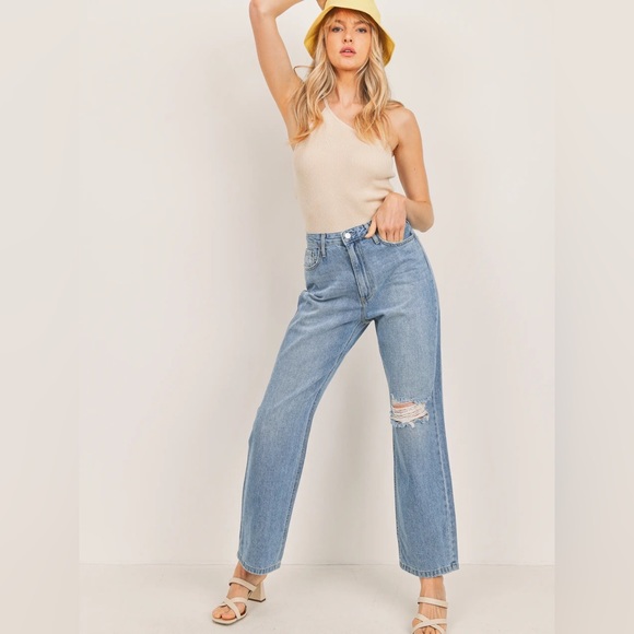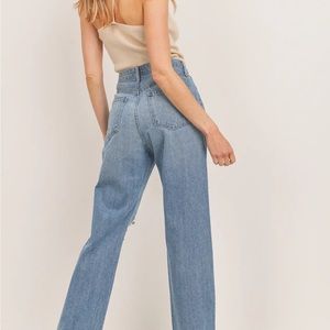 With a throwback cut and single ripped knee, this high-rise straight jean is giving us serious "last day of school" vibes. Perfect for all the chill days and warm nights of summer.