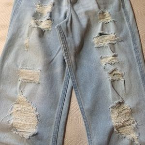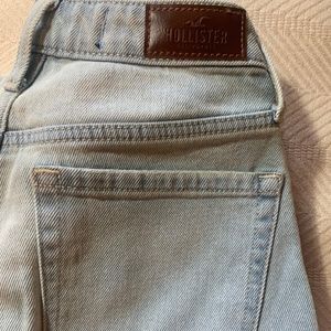 This is a pair of Hollister "curvy ultra high-rise mom jean" in a very pale blue wash. The waist is 24" and length is 27" size 0. Distressing throughout the front of the jeans, the back is free of distressing. Only worn a few times.