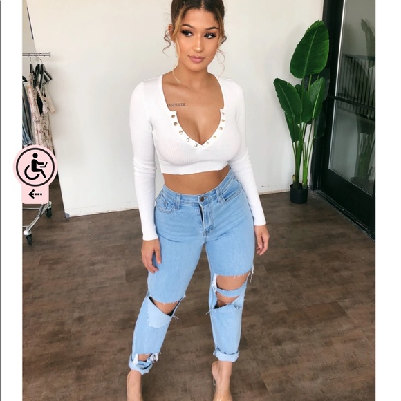 Mom jeans with some stretch and multiple distressed details on both front legs of jeans, Jeans are great for many occasions and perfect with many of our cropped tops