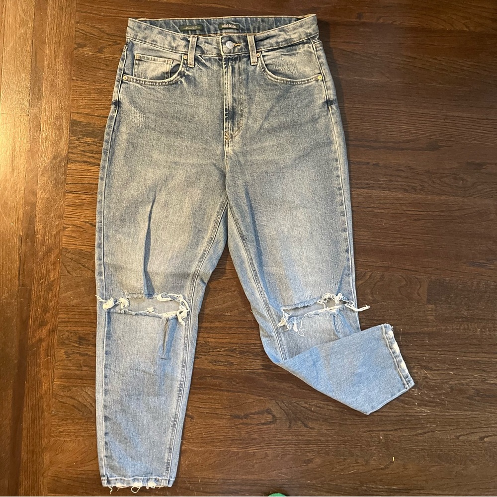 Trendy high rise jeans. Light blue, like acid wash. Distressed knee details. Perfect for casual wear.