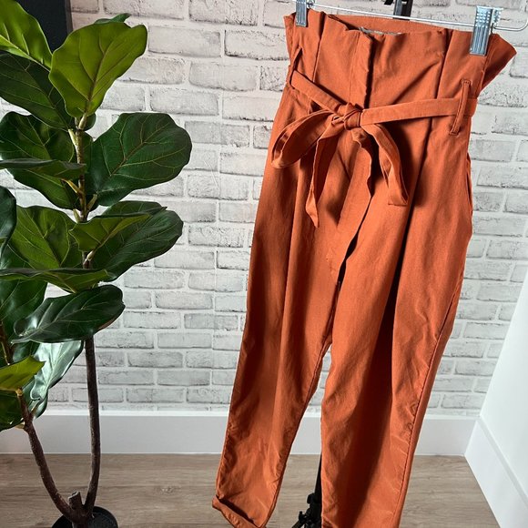 These orange pants come up to the belly button. Fabric is stretchy and fitted.