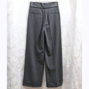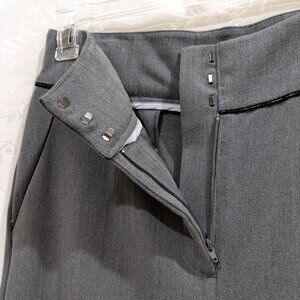 A pair of gray Worthington trousers, in size 4. High rise, relaxed leg. Black piping at waist and side pockets. Two side slash pockets, two back pockets. Front and back dart shaping. 3 hook and zipper fly closure. Features smart looking sewn up cuffs, which measure 12 inches across laid flat for a stylish flare. Slight stretch, machine washable. 28 inch waist, 36 inch hips, 12.5 inch rise, 32 inch inseam.