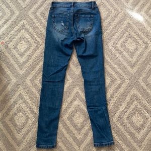 -These jeans are medium wash and high rise (The first picture looks darker because it was taken with flash, the rest are all taken without flash). These jeans have distressing from the high to the knee and also some distressing near the pockets.
