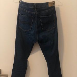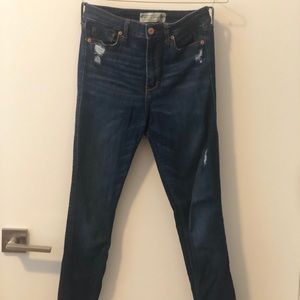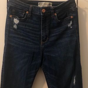 Comfiest pair of jeans I own! Abercrombie skinny jeans in dark wash with light ripping and great pockets.